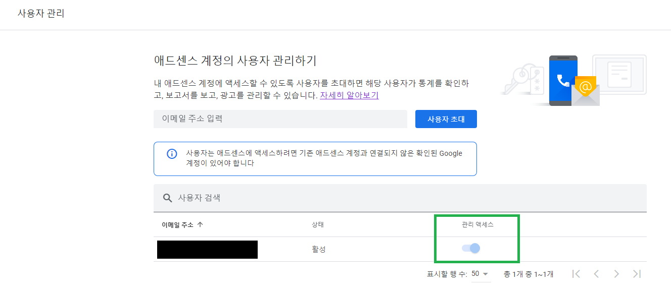 사용자 관리 페이지를 보면 다음과 같이 관리 액세스 체크 여부를 확인해서 관리 권한을 확인할 수 있다.