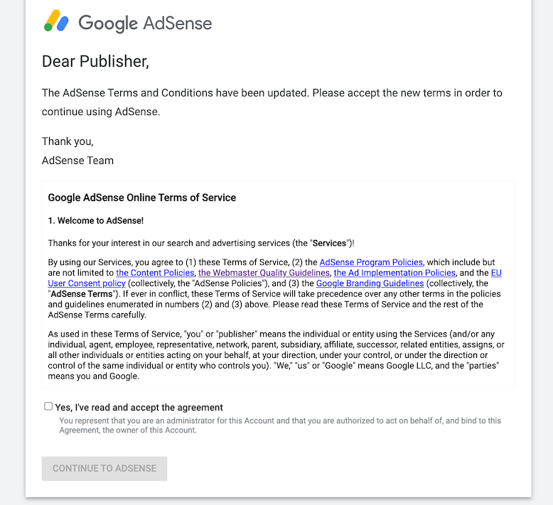 애드센스에서 약관을 업데이트하면서 약관 동의를 하지 않으면 접속을 하지 못하게 해버렸다.